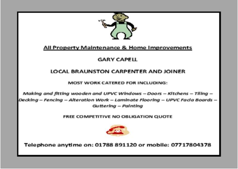 To hire the hall visit the website: www.braunstonvillagehall.org.uk, email braunstonmemorialhall@gmail.com or call the Bookings Secretary on 07890 072487