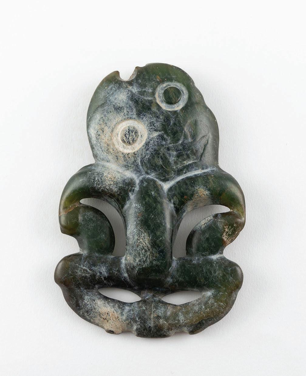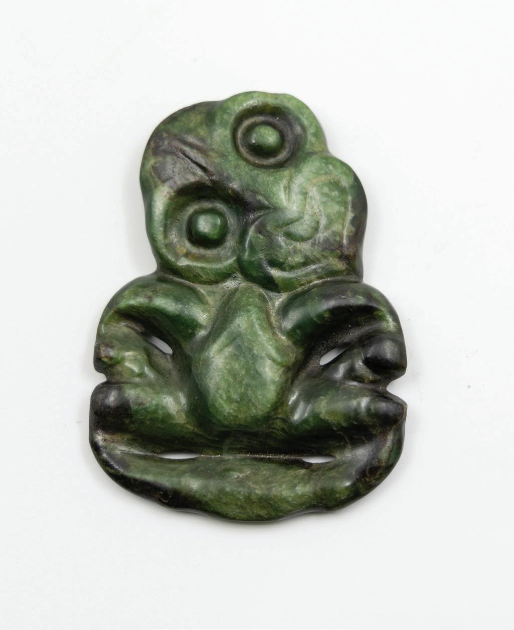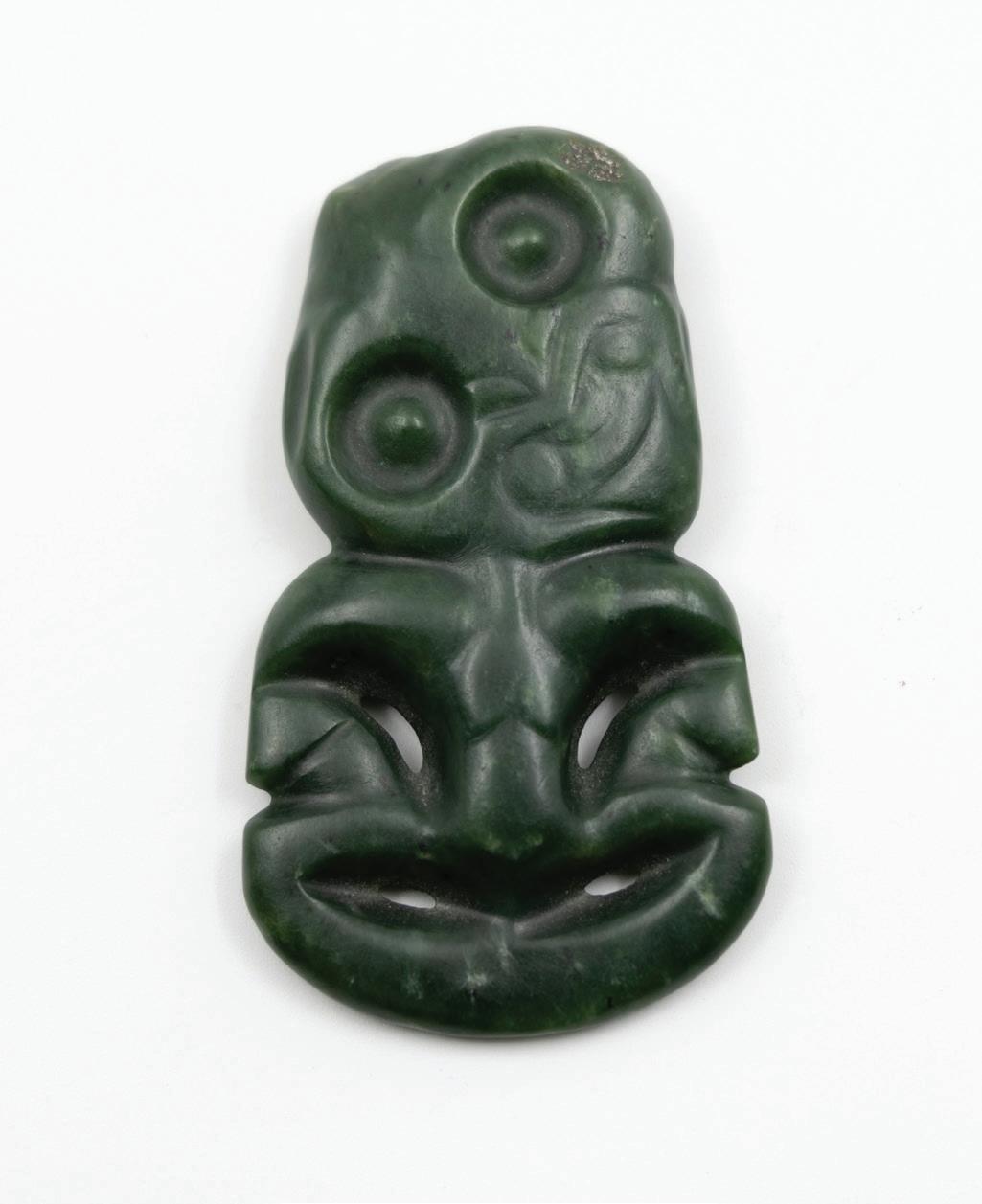 Carve in Kawakawa variety stone with pale inclusions and natural scarring to the surface. Partially drilled suspension hole.