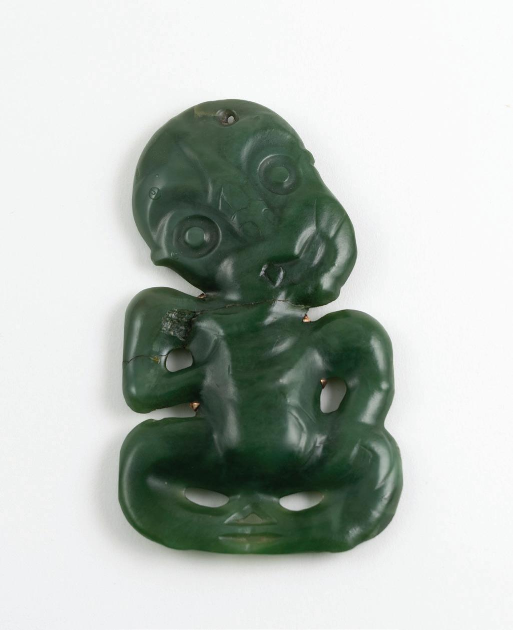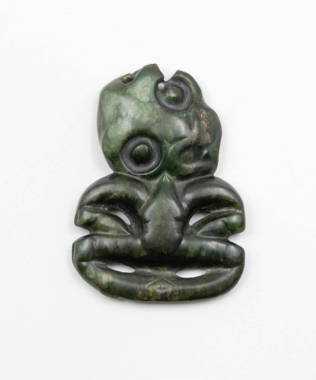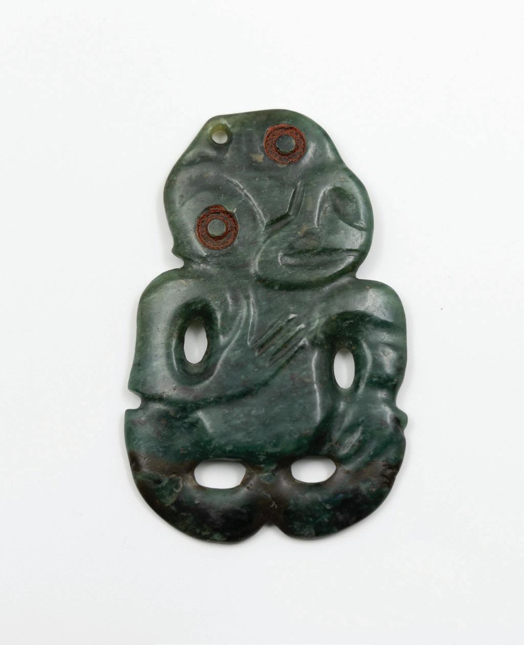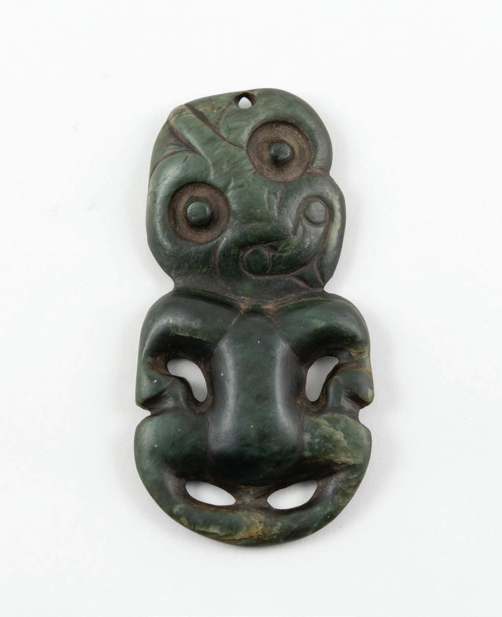 Carve in Kawakawa variety stone with pale inclusions and natural scarring to the surface. Partially drilled suspension hole.
