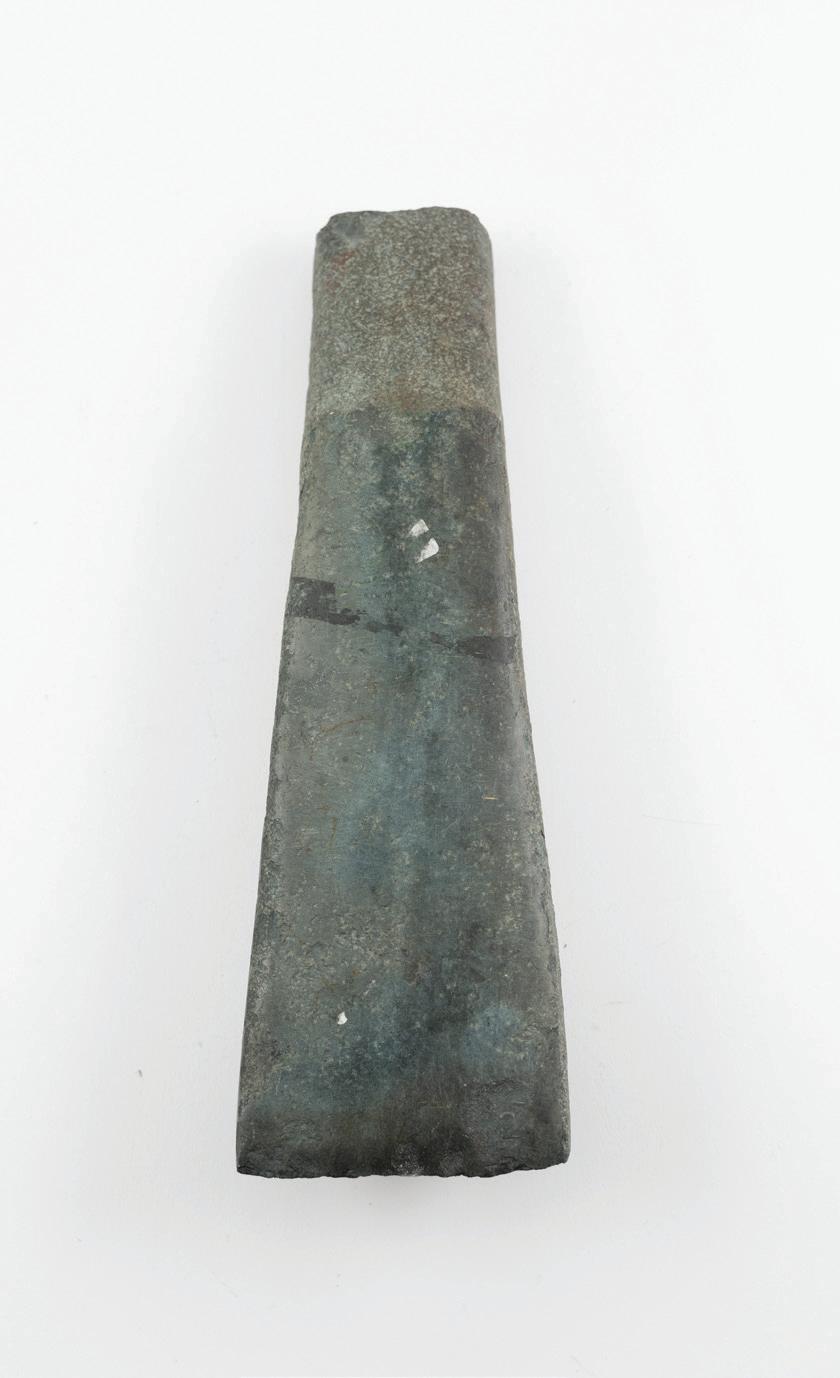 Tapering rectangular form with hammer dressed tang and small amount of flaking to the poll. Lateral edges and bevel well defined with sharp cutting edge. Highly polished throughout. Small chip to the blade. L31.5cm. Y16332