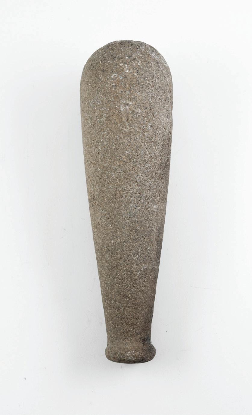 Hammer dressed volcanic stone with circular cross-section tapering to the handle base.