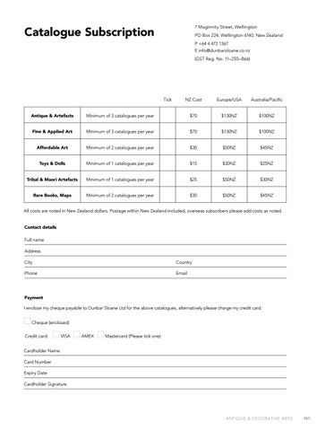 Payment I enclose my cheque payable to Dunbar Sloane Ltd for the above catalogues, alternatively please charge my credit card. Cheque (enclosed) Credit card: