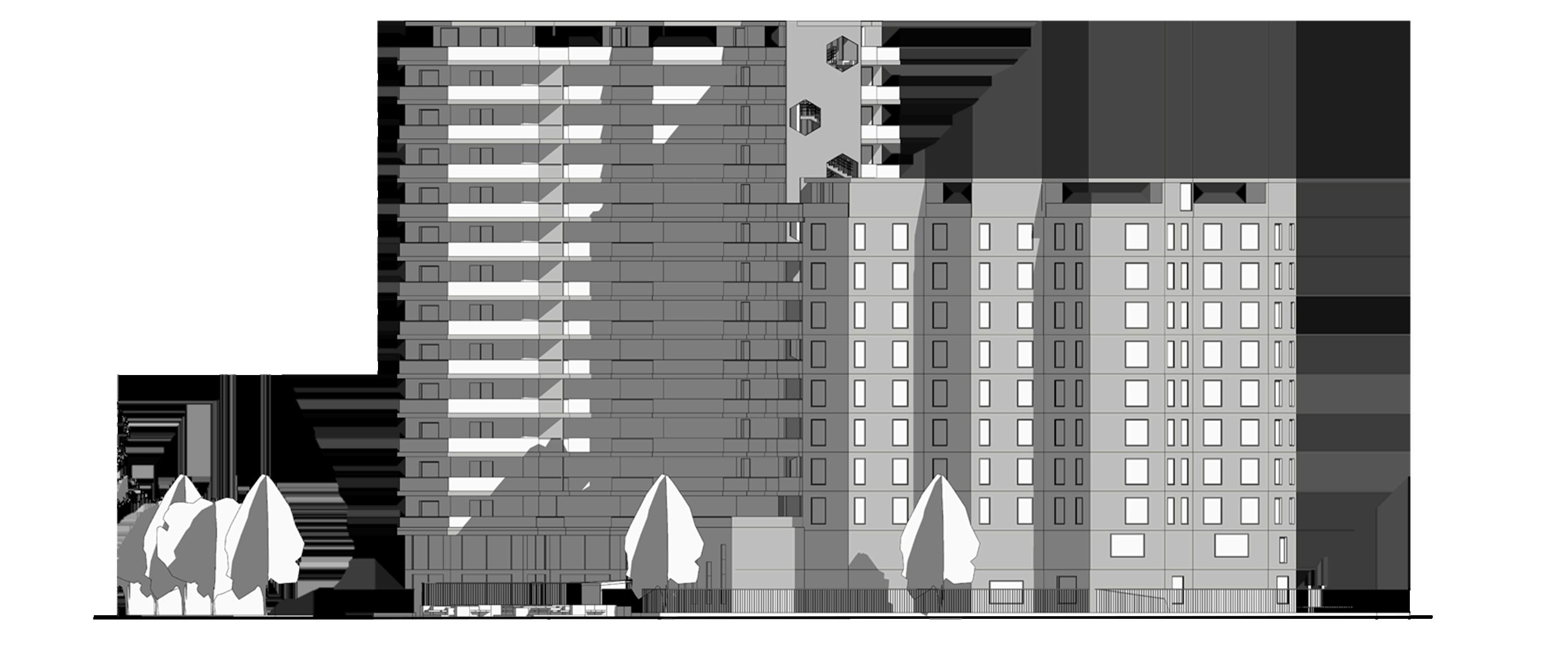 ue revitaliza el entorno urbano, mejorando la calidad de vida de los residentes como la seguridad y estética del lugar, las cuales se han empo con presencia de construcciones abandonadas y en mal estado. La solución arquitectónica principal se compone de dos torres o central que utiliza los dos primeros niveles del edificio como un area común para los residentes del lugar. Este sector alberga una zona salas de estudios. Ambas torres desempeñan distintos papeles en cuanto al rol de la vivienda, siendo una de ellas pensada como una da se enfoca en unidades enfocadas para estudiantes y jovenes profesionales que desempeñan su día a día en el sector.