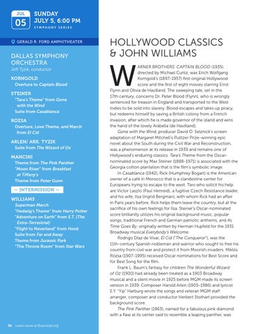ARNER BROTHERS’ CAPTAIN BLOOD (1935), directed by Michael Curtiz, was Erich Wolfgang Korngold’s (1897-1957) first original Hollywood score and the first of eight movies starring Errol Flynn and Olivia de Havilland. The sweeping tale, set in the 17th century, concerns Dr. Peter Blood (Flynn), who is wrongly sentenced for treason in England and transported to the West Indies to be sold into slavery. Blood escapes and takes up piracy, but redeems himself by saving a British colony from a French invasion, after which he is made governor of the island and wins the hand of the lovely Arabella (de Havilland). Gone with the Wind, producer David O. Selznick’s screen adaptation of Margaret Mitchell’s Pulitzer Prize-winning epic novel about the South during the Civil War and Reconstruction, was a phenomenon at its release in 1939 and remains one of Hollywood’s enduring classics. Tara’s Theme from the Oscarnominated score by Max Steiner (1888-1971) is associated with the Georgia cotton plantation that is the film’s symbolic image. In Casablanca (1942), Rick (Humphrey Bogart) is the American owner of a café in Morocco that is a clandestine center for Europeans trying to escape to the west. Two who solicit his help are Victor Laszlo (Paul Henreid), a fugitive Czech Resistance leader, and his wife, Ilsa (Ingrid Bergman), with whom Rick had an affair in Paris years before. Rick helps them leave the country, but at the sacrifice of his own feelings for Ilsa. Steiner’s Oscar-nominated score brilliantly utilizes his original background music, popular songs, traditional French and German patriotic anthems, and As Time Goes By, originally written by Herman Hupfeld for the 1931 Broadway musical Everybody’s Welcome. Rodrigo Díaz de Vivar, El Cid (“The Conqueror”), was the 11th-century Spanish nobleman and warrior who sought to free his country from civil war and protect it from Moorish invaders. Miklós Rózsa (1907-1995) received Oscar nominations for Best Score and for Best Song for the film. Frank L. Baum’s fantasy for children The Wonderful Wizard of Oz (1900) had already been treated as a 1903 Broadway musical and a silent movie in 1925 before MGM made its screen version in 1939. Composer Harold Arlen (1905-1986) and lyricist E.Y. “Yip” Harburg wrote the songs and veteran MGM staff arranger, composer and conductor Herbert Stothart provided the background score. The Pink Panther (1963), named for a fabulous pink diamond with a flaw at its center said to resemble a leaping panther, was