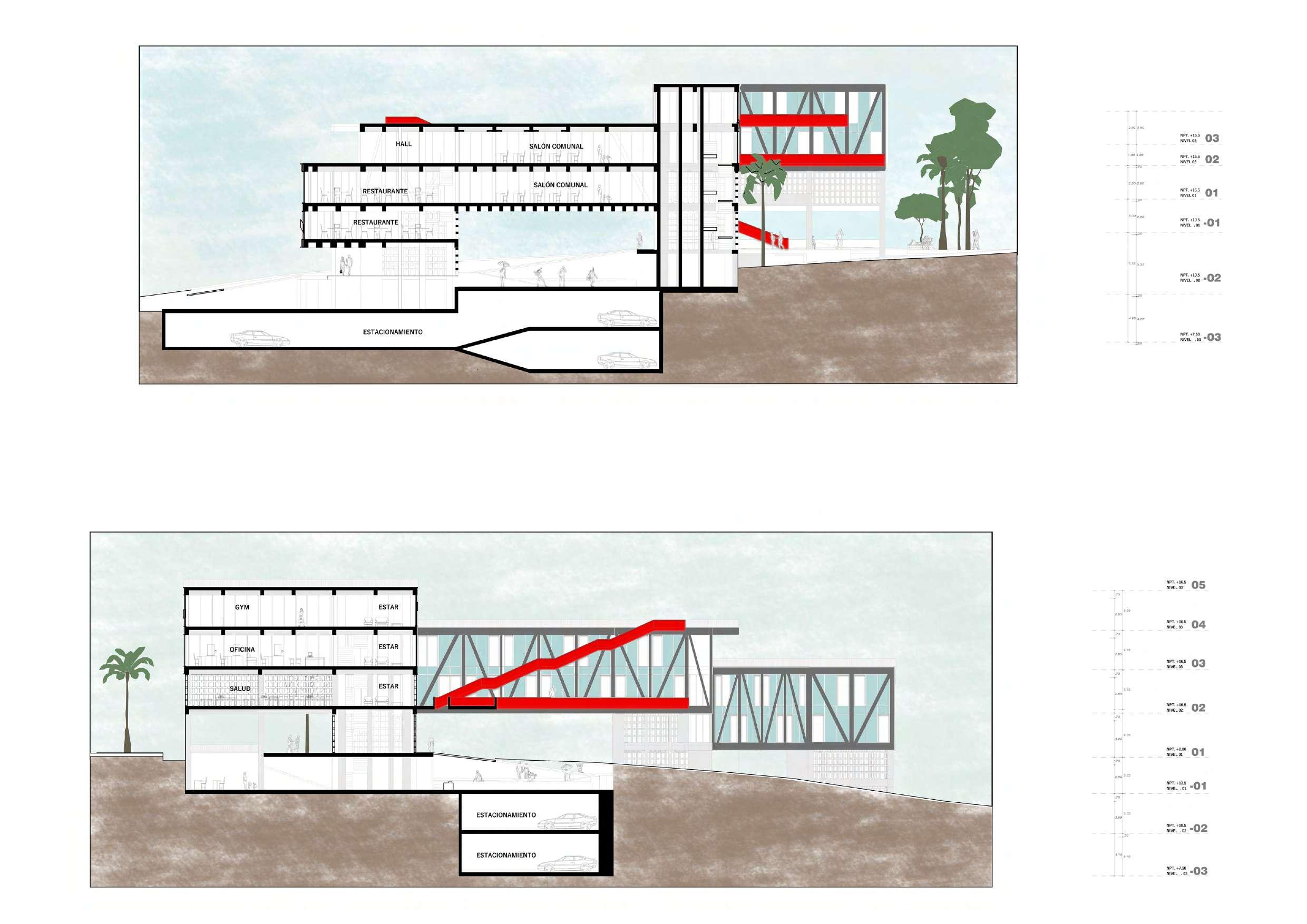 Aprovechando la topografía se generan un proyecto escalonado con el n de aprovechar estas terrazas y crear miradores o jardines que aporten a la ciudad.