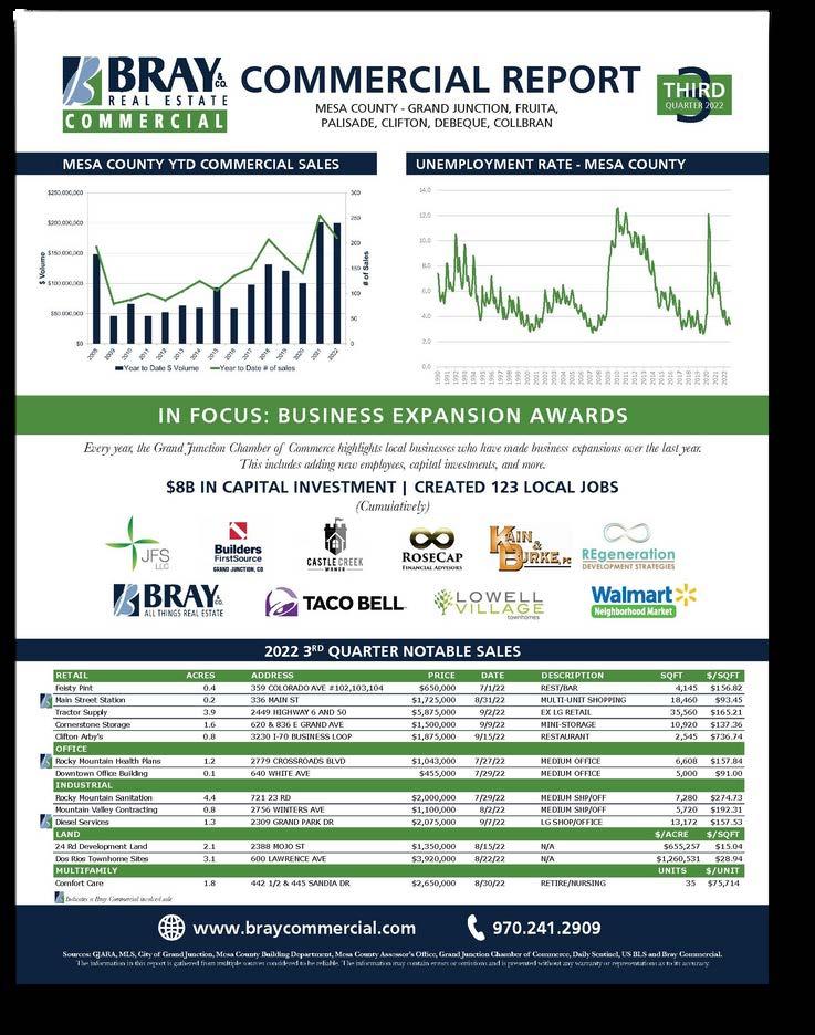 The Bray Commercial Report is published quarterly by Bray and Company. A unique report that tracks trends and information important to local businesses. Created solely for Bray Commercial Brokers in conjunction with Colorado Mesa University Economic Outlook.