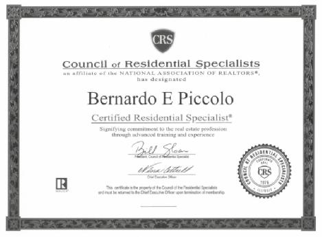 Um Certified Residential Specialist - CRS é um “Real Estate Professional” com “Special Expertise”: baseado no conhecimento adquirido, no estudo avançado de mercado, venda, compra, investimento, “taxes” e na experiência comprovada através do volume de transações imobiliárias registradas. Mais de 800 Famílias Satisfeitas.