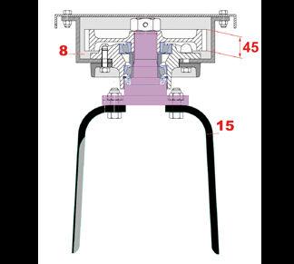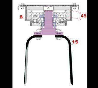 Auge de 8 mm d’épaisseur, arbres de 60 mm soutenus par des roulements coniques de haute qualité protégés par un joint d’huile inférieur et un labyrinthe mécanique. Porte-lame cannelé boulonné sur l’arbre avec raccord conique. L’arbre de la boîte de vitesses est fixé au rotor par une bride cannelée facilitant le retrait de la boîte de vitesses et réduisant les vibrations et contraintes provoquées par les rotors.