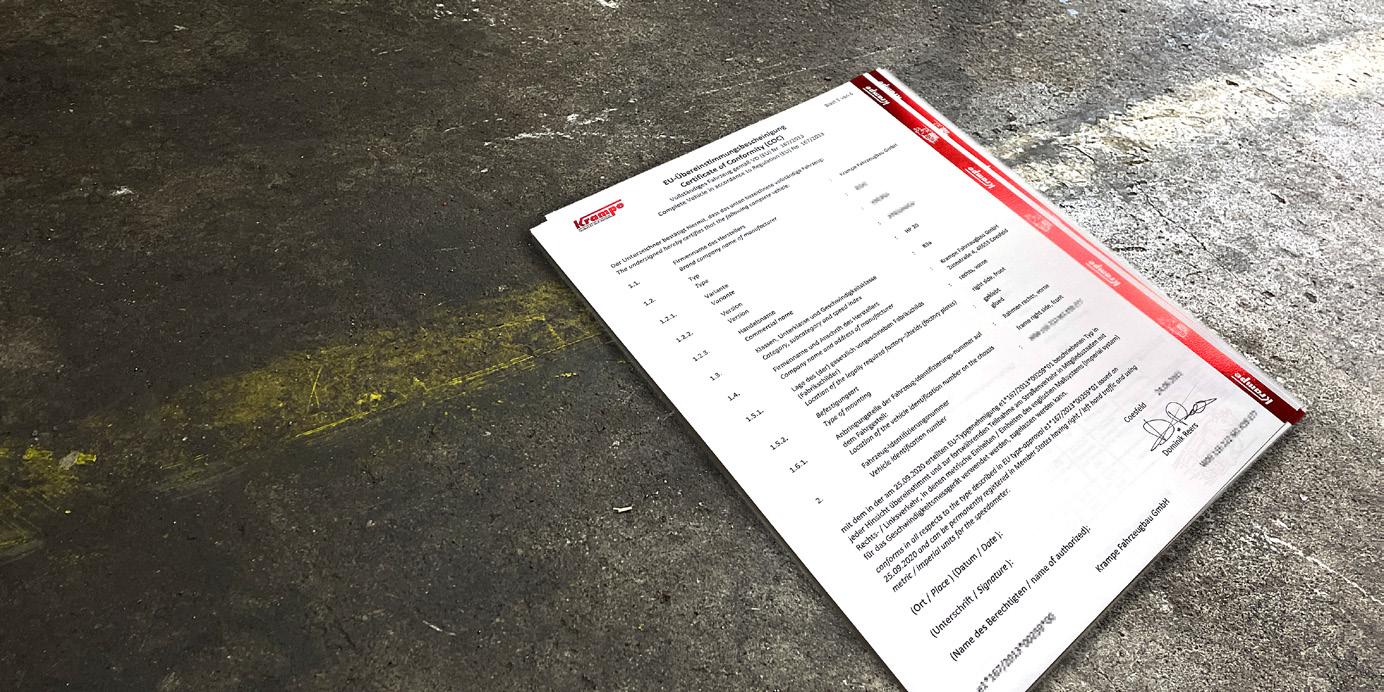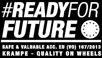 Since the end of 2020, all Krampe vehicles are delivered according to the EU type-approval EU (VO) 167/2013. This guarantees a simple homologation and assures a high value retention.