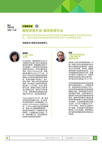Tradewin中国 总经理 作为总经理,陈宥辰领导Tradewin 中国团队并负责公司在中国地区运 营的总体管理。她掌握着大量关于 在中国报关、中国贸易法规和贸易 政策的专业知识,并有丰富的实践 经验。在加入Tradewin之前,陈宥 辰在通用电气公司工作了12年,并 担任一系列与在中国和亚洲其他国 家报关以及贸易合规管理相关的职 务,如海关战略行动负责人– 亚太 地区/中国、海关一体化和流程项目 经理– 亚太地区以及海关和贸易合 规负责人– 大中华区。在加入通用 电气之前,她曾在艾默生公司负责 亚太区物流业务。她毕业于华东理 工大学,拥有美国项目管理协会颁 发的PMP认证,会说流利的英语。 Tradewin成立于1997年,是一家专 业的贸易咨询服务公司。作为全球 顶尖物流和报关公司康捷国际(Expeditors International)的全资子公 司,Tradewin提供与报关和监管事 务、物流以及交易数据管理相关、 集创意与有效性于一体的解决方案 和指导。公司提供进出口合规、分 类、贸易优惠计划、关税减免和供 应链安全领域的咨询服务。