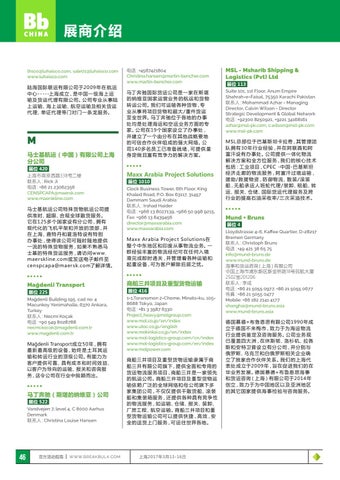 Mund + Bruns 展位 4 Lloydstrasse 4-6, Kaffee Quartier, D-28217 Bremen Germany 联系人:Christoph Bruns 电话:+49 421 38 65 75 info@mund-bruns.de www.mund-bruns.de 海事和货运咨询(上海)有限公司 中国上海市浦东新区新金桥路18号民航大厦 2502室201206 联系人:李成 电话:+86 21 5055 0977, +86 21 5055 0677 传真:+86 21 5055 0477 Mobile: +86 182 2141 4177 shanghai@mund-bruns.asia www.mund-bruns.asia