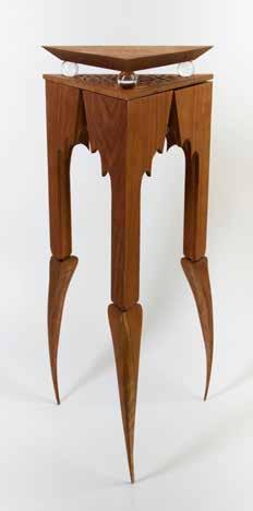 Made primarily out of Cherry with accents of Birch, the table stands at a height of 24" and is approximately 10" in width. The table illuminates from within to create a warm, pleasant glow that casts the carving's pattern into the surrounding environment.