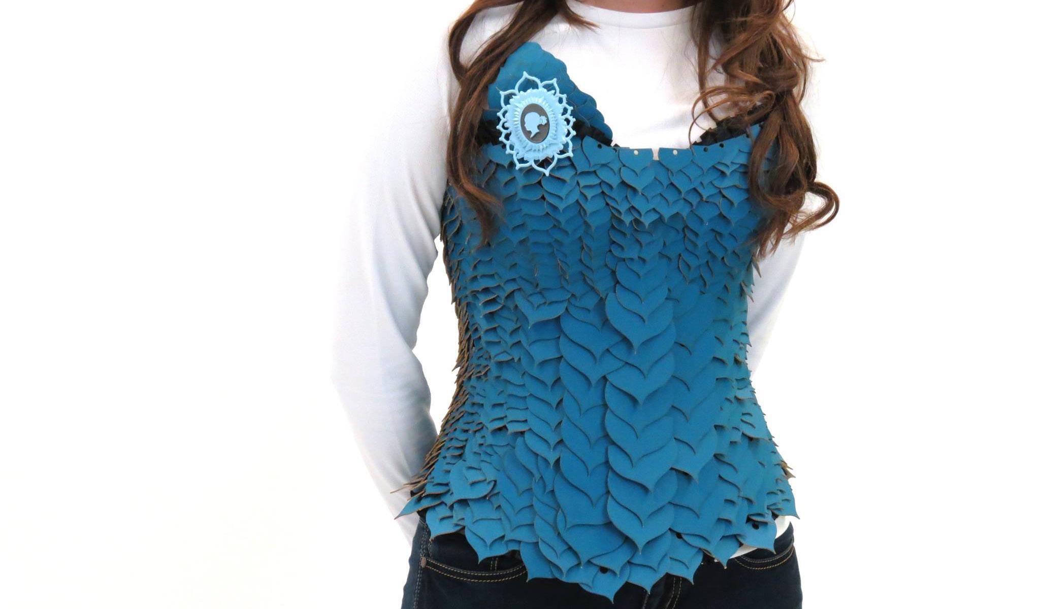 A wearable garment and accompanying piece of 3d printed jewelry. The corset was based off a tectonic system of scales that were placed and sized according to the muscular system/movement in the torso. The broach was inspired by the scale shape. This was a partner project.