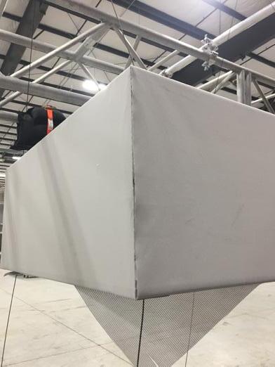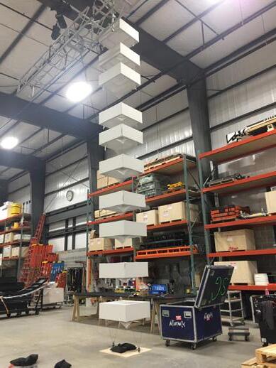 Chain motors are plotted and hung. Truss is attached for structure and lighting is applied. Some drapes are also hung at this time.