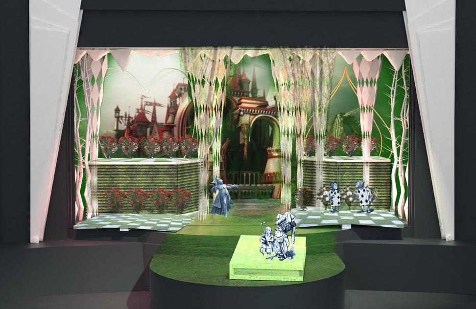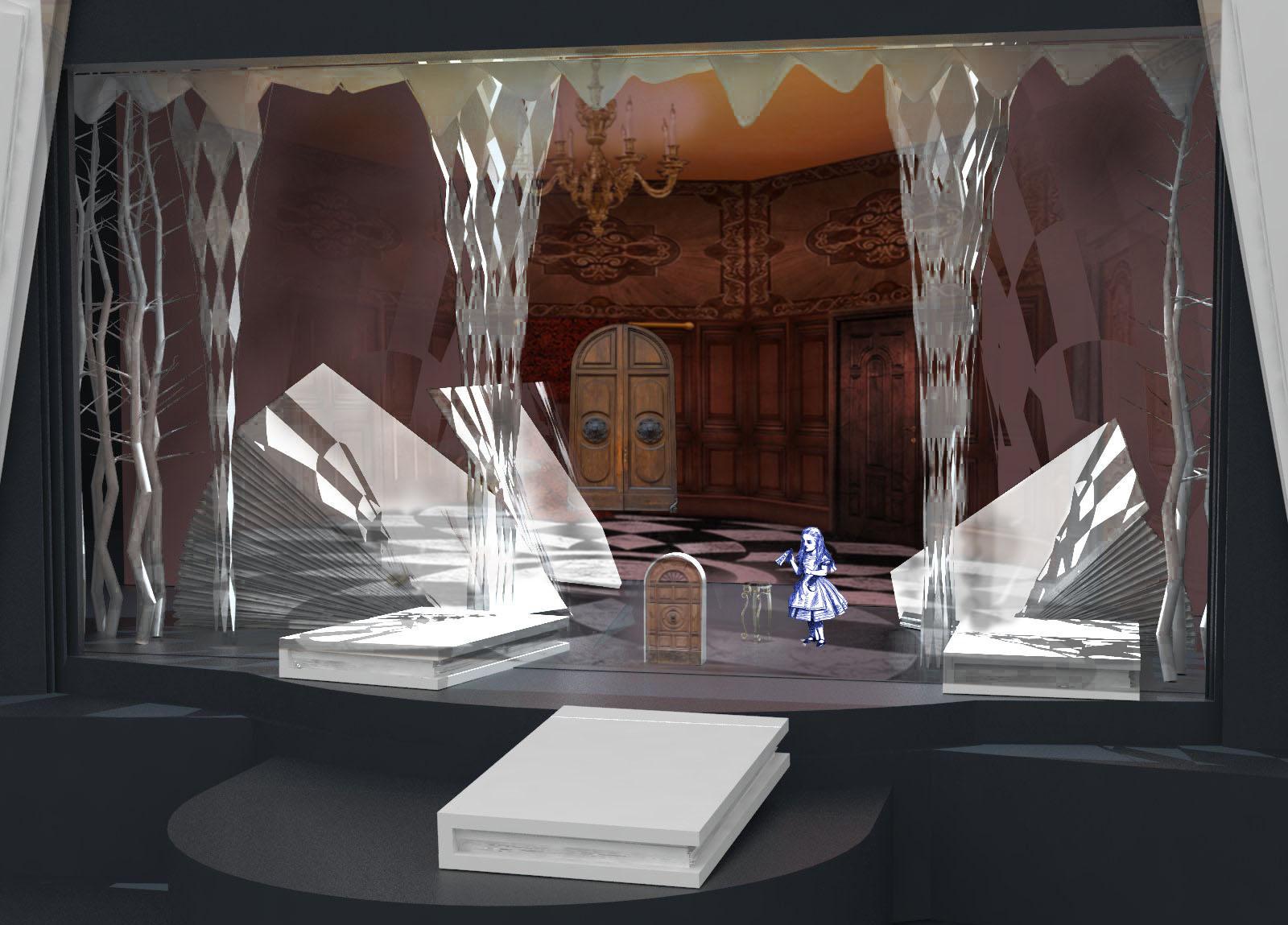 This was a Thesis Design Project; a Set Design for Alice In Wonderland.This set design was built to fit into the Vivian Beaumont Theater in New York City. The design played with the ideas of what the future of theater might look like, and how technology could help. 3D projection mapping is implimented throughout the show, as well as holographics, body cameras, hydrolics, video screens, magnetic floors, and of course traditional theater magic. The goal was to find ways to provide the audience with a more inclusive and imersive experience.