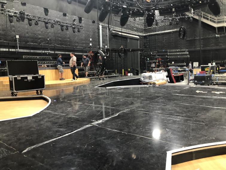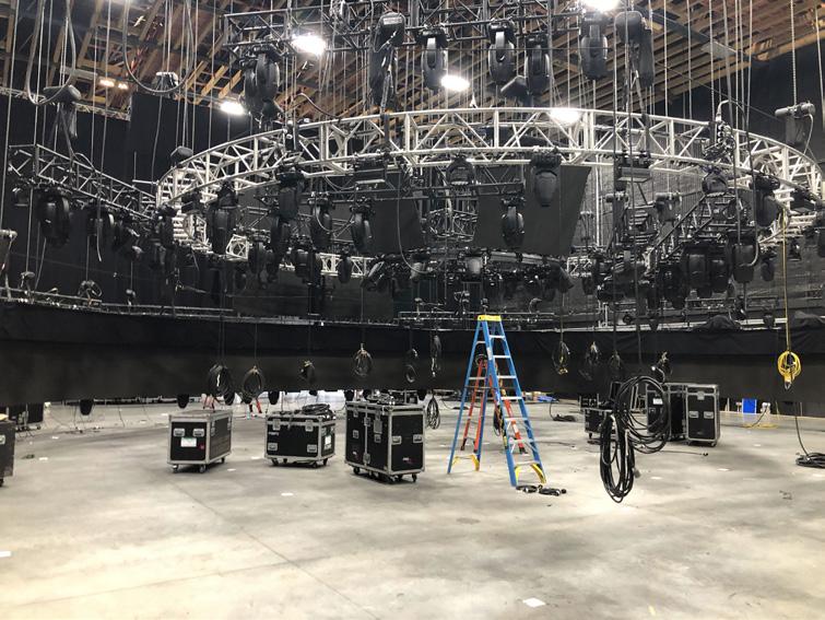 Exterior arena walls are installed as well as show stairs for the audience. Some Video is also installed.