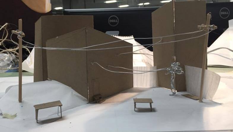 The lines overhead represent the morality lines or social situations we come across throughout our lives. They help portray to the viewer just how many of these choices we must make and how people cross those lines or change views based on outside pressures. The stage platforms are asymmetrical to represent the imbalance that certain characters press on others throughout the story.