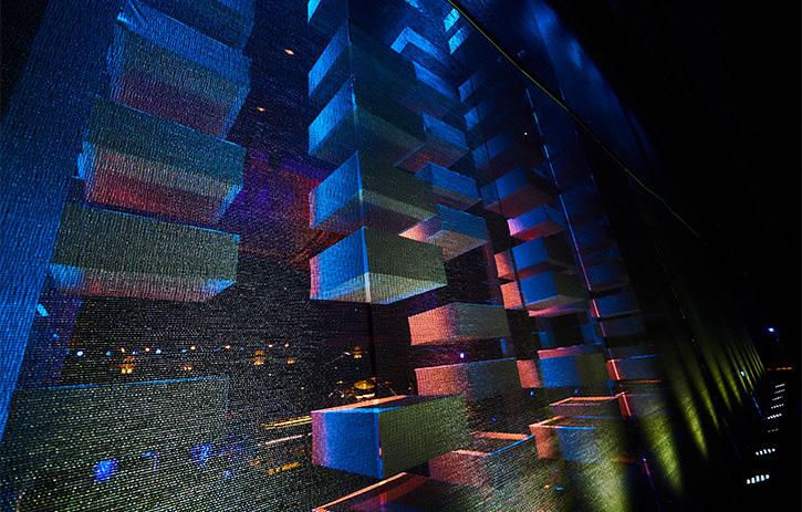 This set was built to be transparent and opaque, depending on lighting options. The "floating boxes" are made out of fabric wrapped around a plywood frame, then swaged in place and flown straight out of their shipping container. A counter weight was designed and installed to ensure the fabric remained taut on stage.
