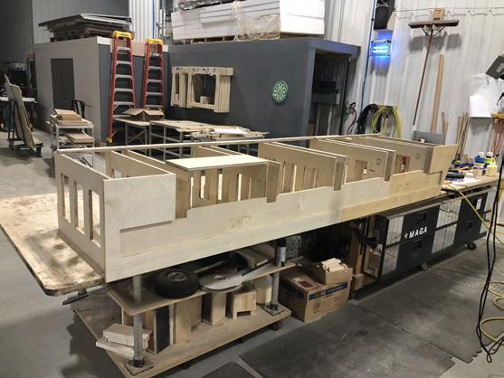 More than 62 constuction drawings were made for this set. The drawing shown on the right is an example of a section of the Team Entrance Walls. It details out for the shops what skins should be used and their location, as well as bolt hole size/dimensions and LED lengths. One shop drawing can hold information for the Metal, Wood, Power, and Road Department. Some of the Shop's process is shown by photos on the far right side of the page.