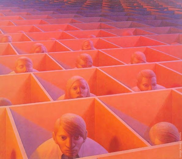George Tooker’s mid-20th century paintings illustrate the emotions of everyday urban life. The abstracted forms depict the city-like qualities of street grids, mass versus void, and the repetition of squared units. The expressions and body language of his muses also emphasizes the emotional impact of life under urban conditions controlled by the gaze.