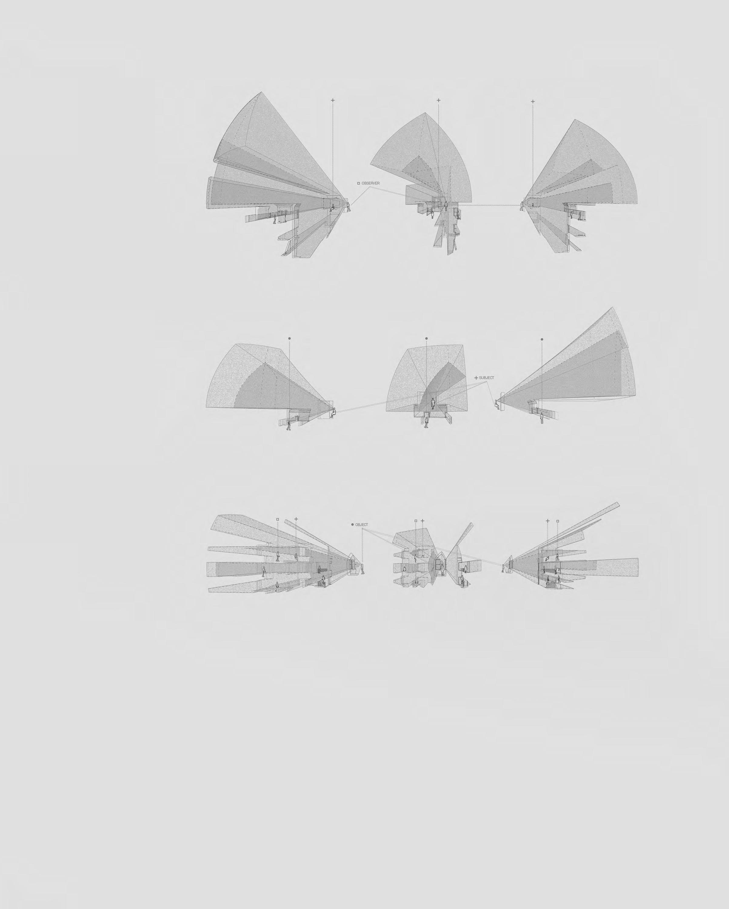 The creation of a typical city block based on the reconstruction of three New York-set Hopper paintings, acts as a set to understand a series of visual interactions that endlessly take place. A sequence of gazes formalizes the gaze of the observer, the gaze of their subject, and the gaze of the object who stares back. The projection of the visual field, combined with its reaction to the openings and mass it passes through and halts against, constructs a