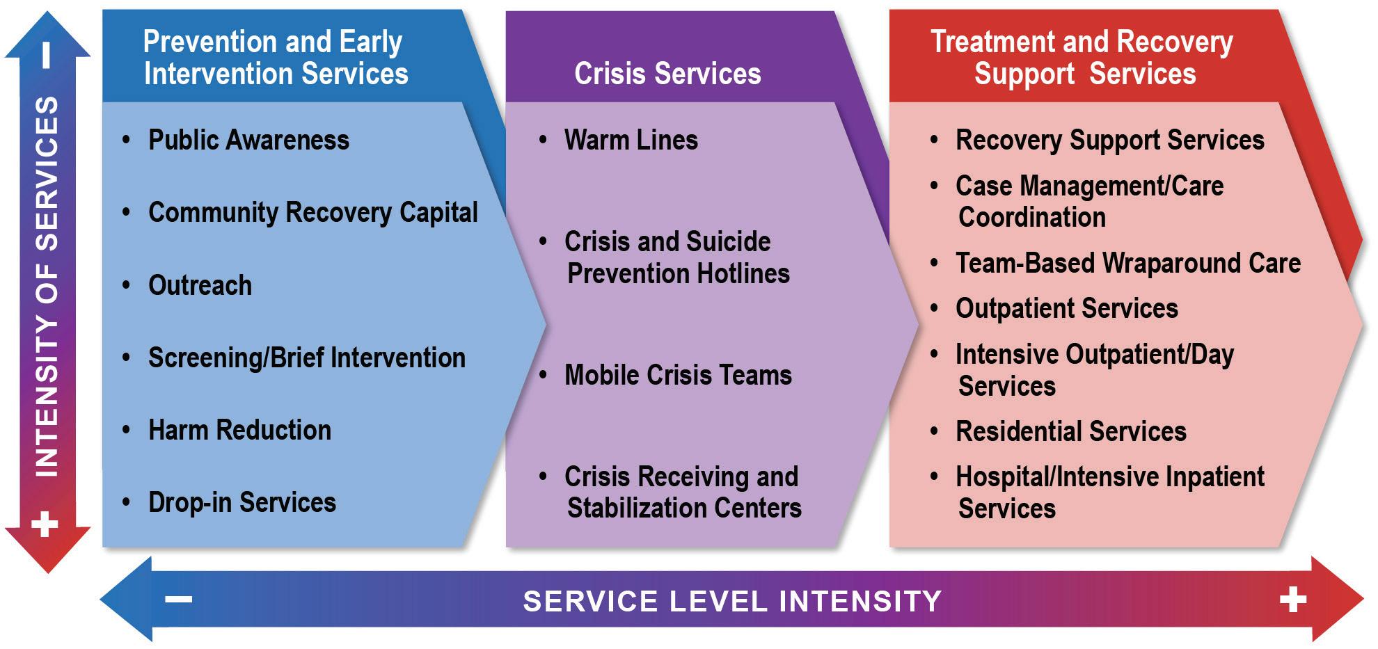 Behavioral health continuum of care:6 An integrated system of care with varying levels of service intensity and settings in response to an individual’s behavioral health needs.