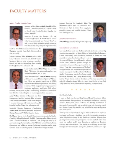 Social studies teacher Matt Mayer and his wife, Katie (Witchger) ’99, welcomed newborn son Michael Patrick on Jan. 28, 2010. Social studies teacher Franklin Oliver recently published his second book of poetry, “Myths.” Mr. Oliver was recently interviewed in JAWS, the Indianapolis Recorder’s Journalism and Writing Seminars, which is a paid internship program for MATT MAYER freshman, sophomore and junior high school students. The mission of JAWS is to develop professional communication skills for youth who plan on pursuing journalism as a career.