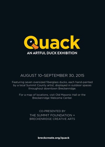 AUGUST 10–SEPTEMBER 30, 2015 Featuring seven oversized fiberglass ducks, each hand-painted by a local Summit County artist, displayed in outdoor spaces throughout downtown Breckenridge. For a map of locations, visit Old Masonic Hall or the Breckenridge Welcome Center.