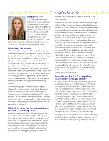 questions of my students, Mr. Crow’s humor in creating an open dialogue with students outside of class, Ms. J’s incredible organization, and Ms. Gentry’s unmatched energy. Simply put, I am a teacher today because of the outstanding and dedicated teachers I had throughout my twelve years at Breck, and the support of my family and faculty at Colby.