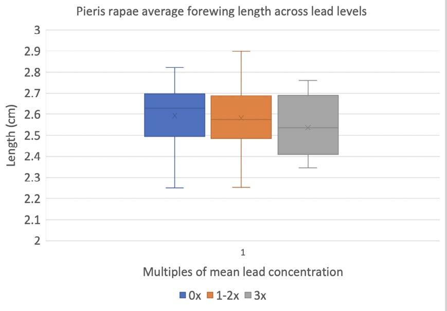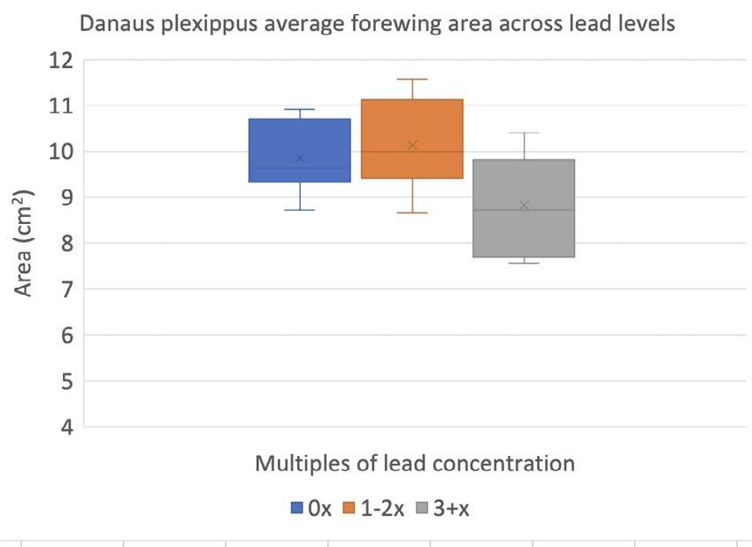 The sample sizes in this analysis were relatively small for each exposure level and type of butterfly, in part due to increasing restrictions on protocol for collecting D. plexippus. This was likely the reason that no ANOVA test showed a significant difference between the groups, while combining ‘low’ area measurements returned significant results Work is currently underway to increase the sample size for a more accurate representation of lead’s ecological impacts and ability to detect differences
