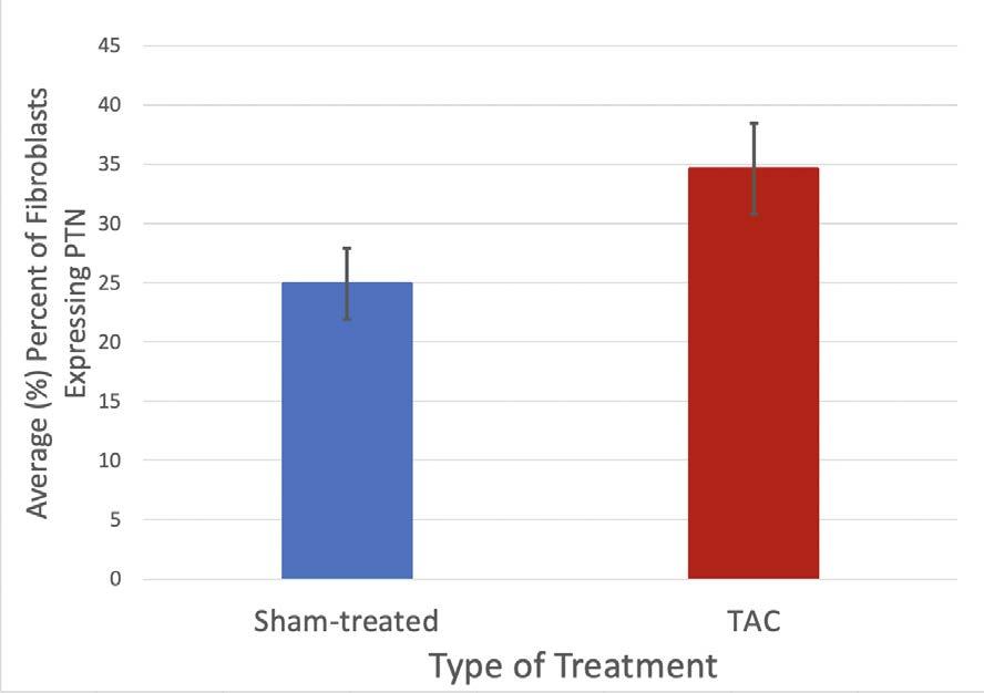 Based on its expression in neonatal activated fibroblasts and its established role in the proliferation of other cell types, we hypothesized that PTN plays a significant role in modulating response to cardiac injury We explored the role of PTN after cardiac injury in mice, using Transverse Aortic Constriction (TAC). TAC is a standard experimental model for pressure overload-induced cardiac hypertrophy and heart failure in mice (deAlmeida et al., 2010). TAC initially induces compensated heart hypertrophy, which is often associated with a relative increase in ventricular contractility (deAlmeida et al., 2010) The induced cardiac hypertrophy comes from the ligation of the transverse aorta, causing pressure overload that simulates natural heart failure (deAlmeida et al , 2010) This process allows researchers to measure cardiac hypertrophy by comparing TAC samples with sham-treated samples, where no constriction is induced.