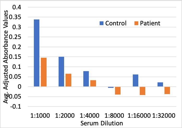 Duplicate control and patient samples were diluted in Solution B at concentrations ranging from 1:1000 to 1:32000 and an ELISA was performed as described, including blank wells containing only Solution B. Adjusted absorbance levels were calculated by subtracting absorbance values from blank wells for each series (Table 2). Average absorbance of the duplicated samples showed a general, but inconsistent decrease with increased serum dilution factors, and was higher for control samples than for patient samples The average adjusted absorbance levels for three patient dilution levels and one control dilution level fell below background (Figure 3)