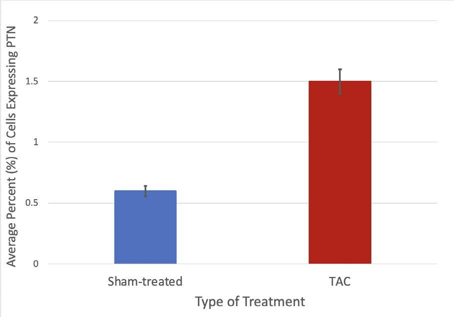 Figure 3. The average percentage (± SEM) of PTN positive cells in 1-Week TAC (red; n = 16) and sham-treated (blue; n= 24) adult mouse cardiac sections.