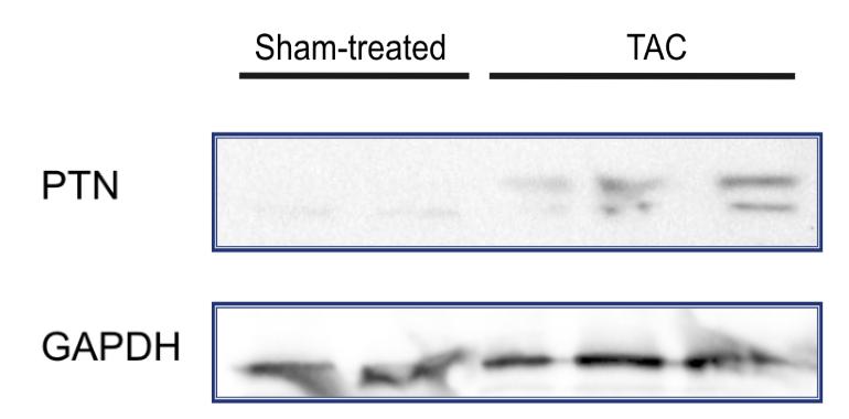 Figure 1. Western blot for PTN (approx 22 kDa) in tissue from three injured (TAC) mouse hearts and two sham-treated mouse hearts. GAPDH was used as a loading control.