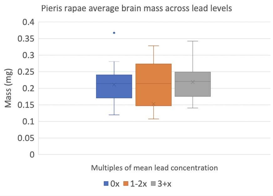 The mean brain mass for P. rapae was 0.211 ± 0 057 mg (n =20), 0 152 ± 0 267 mg (n =16), and 0.218 ± 0.059 mg (n =17) at sites with 0x, 1-2x, and 3+x the average lead concentration, respectively (Figure 3) An ANOVA revealed no significant difference between mean butterfly brain mass collected in areas with 0x, 1-2x, and 3+x average childhood blood lead levels (p=0.619). A two-tailed t-test comparing sites with low (0x and 1-2x) and high (3x) average childhood blood lead levels also revealed no significant difference (p=0.464).