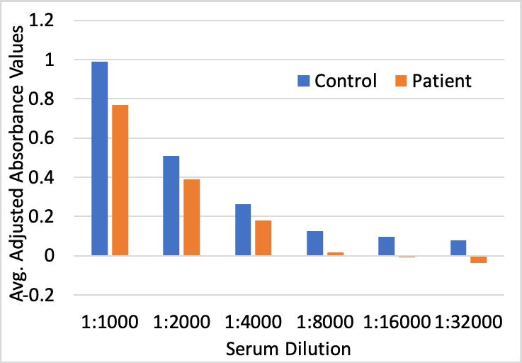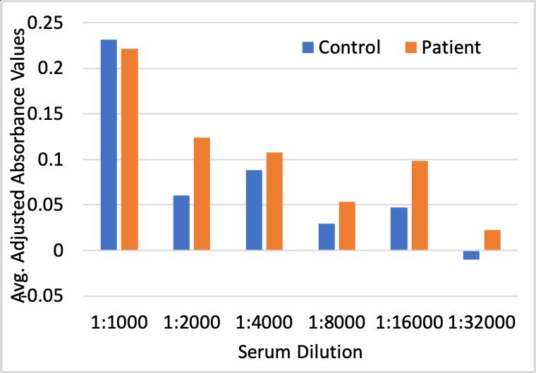 Duplicate control and patient samples were diluted in Solution A at concentrations ranging from 1:1000 to 1:32000 An ELISA was performed as described, including blank wells containing only Solution A. Adjusted absorbance levels were calculated by subtracting absorbance values from blank wells for each series (Table 1). Average absorbance of the duplicated samples showed a general, but inconsistent decrease with increased serum dilution factors. With the exception of the 1:1000 dilution, patient samples generated higher average adjusted absorbance than control samples (Figure 2).