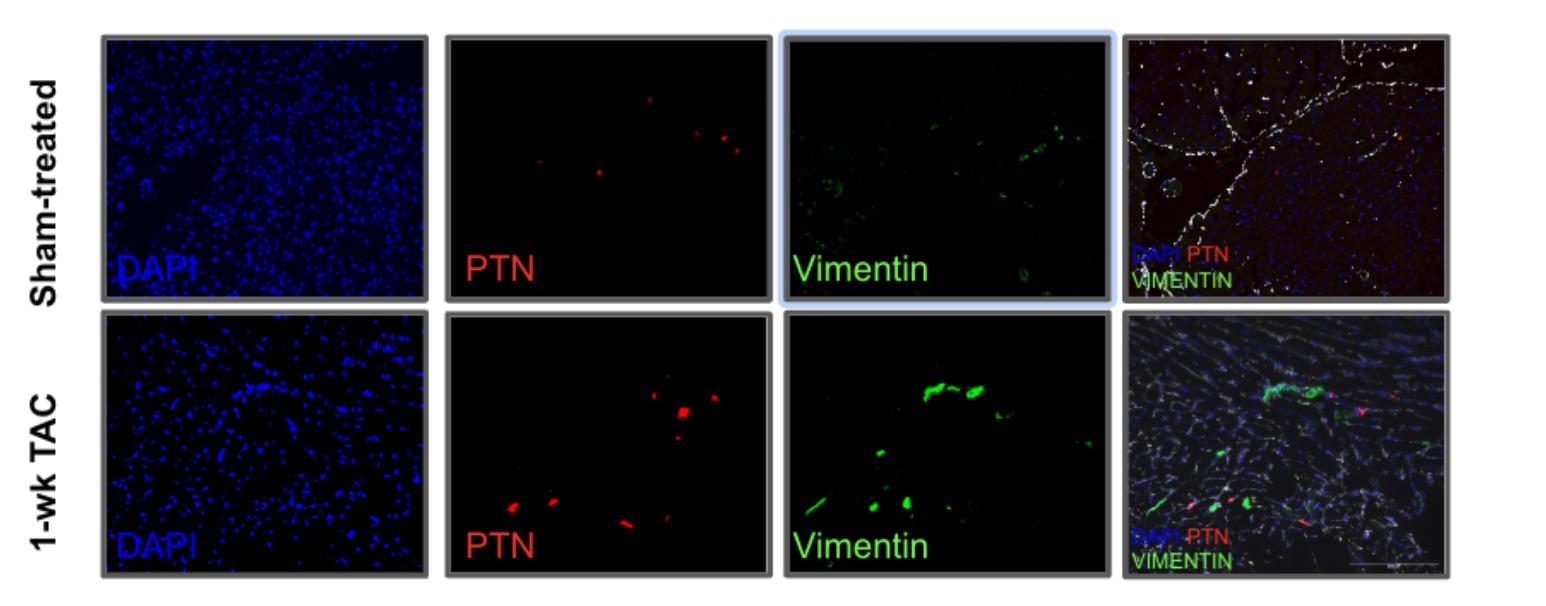 2. Representative images of IHC staining of sham-treated (top) and TAC (bottom) heart sections for DAPI (blue), alpha-SMA (white), PTN (red), and Vimentin (green).