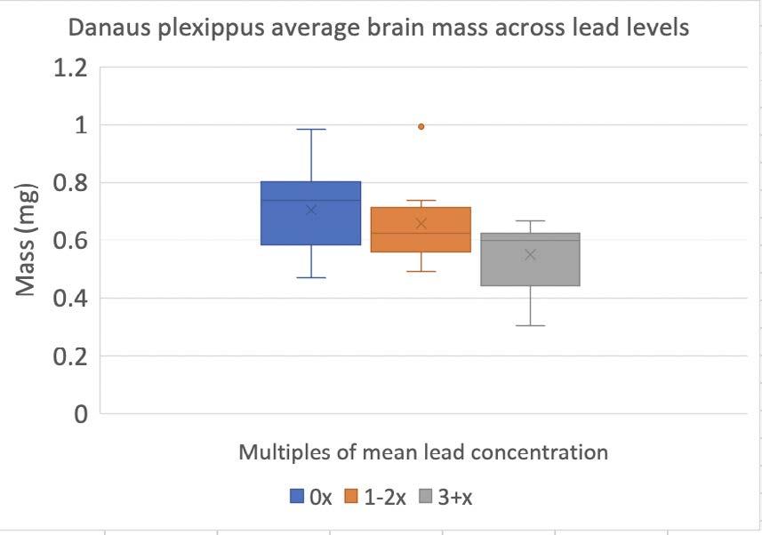 In D plexippus butterflies collected in areas with 0x, 1-2x, and 3+x the average childhood blood lead concentration, the mean brain masses were 0 705 ± 0 150 mg (n =14), 0 658 ± 0 148 mg (n = 9), and 0 549 ± 0 130 mg (n =7), respectively (Figure 4). An ANOVA revealed no significant difference between butterflies collected in areas with 0x, 1-2x or 3x average childhood blood lead levels (p=0.460). A two-tailed t-test comparing low (0x and 1-2x) and high (3x) average childhood blood lead levels revealed a significant decrease in mean brain mass in high lead level areas (p<0 05)