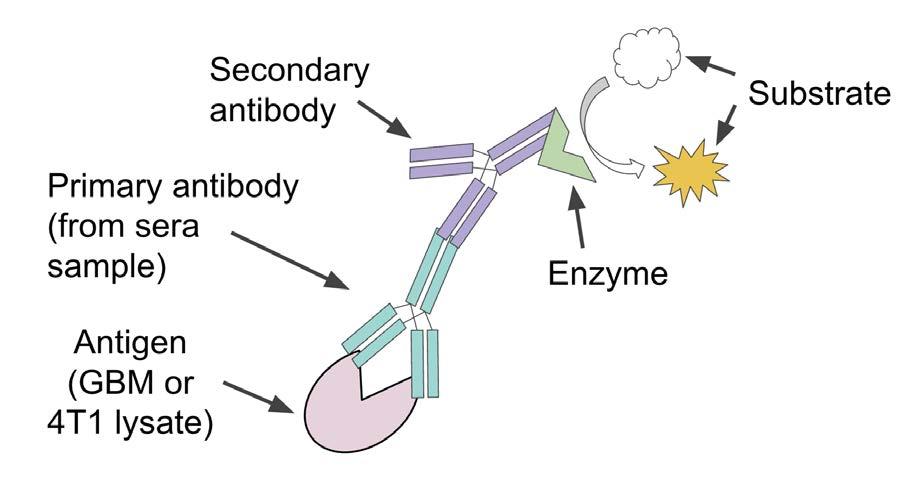 After continued optimization attempts, if the GBM antigen coated plates have similar results to the 4T1 coated plates, this could prompt further reflection into the choice of ELISA. This method is an indirect ELISA In the case of continued failure with the indirect ELISA, it may be worthwhile to try a sandwich ELISA. Sandwich ELISAs typically have a higher signal-to-noise ratio, although they can be more difficult to optimize due to the addition of more elements to the already complicated immune complex (ELISA Technical Guide and Protocols, n.d.).