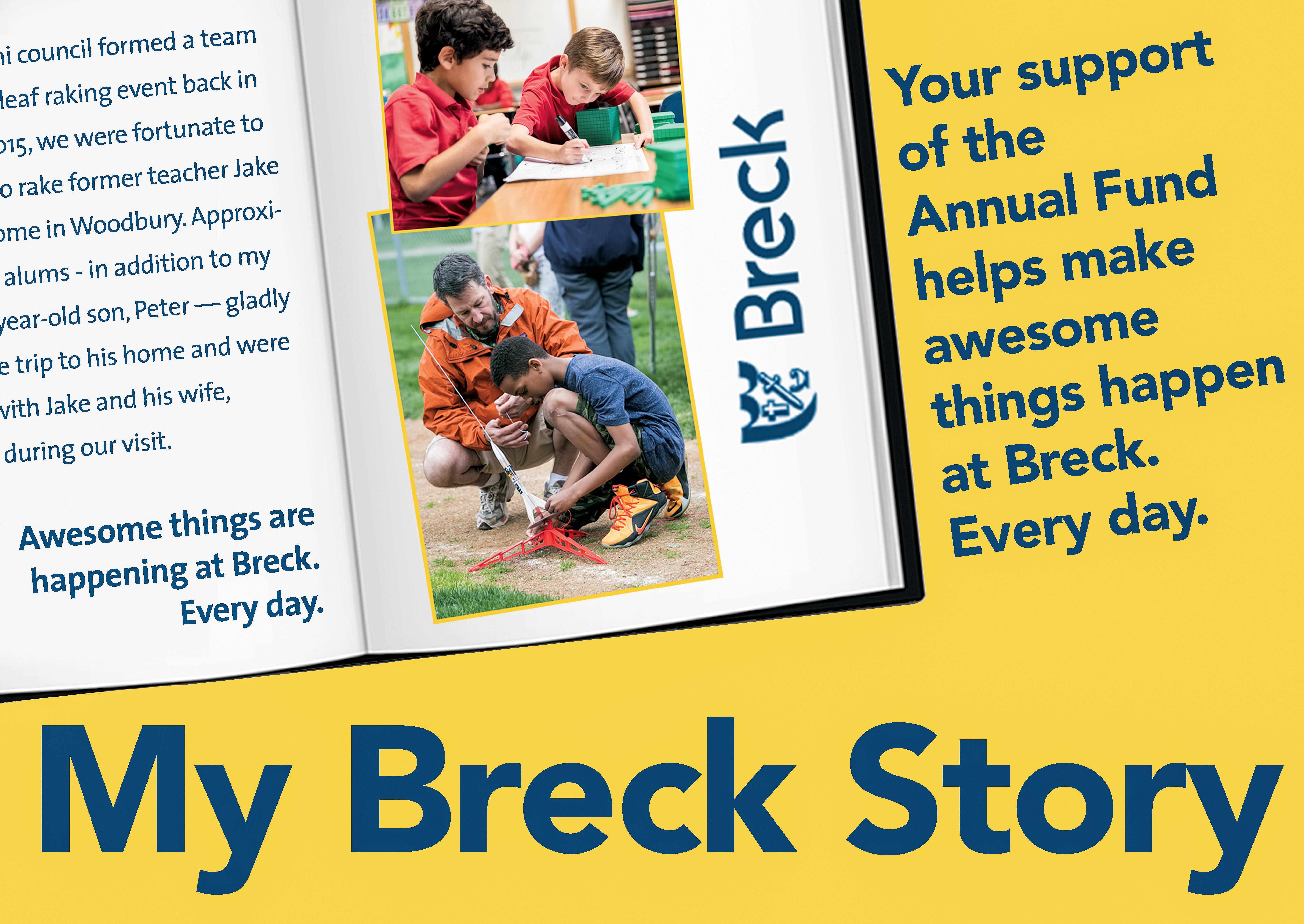 Awesome things are happening every day at Breck thanks to you and the Annual Fund. I greatly appreciate all this year’s Annual Fund donors, Annual Fund volunteers, and, of course, everyone who shared a Breck story. We chose the theme of “My Breck Story” because we knew that all of us would benefit from taking a moment to reflect, share, and listen to these stories — not just the big stories, but the everyday moments that help our children grow as students, people, and citizens. These are the stories that connect us as a community, provide a longitudinal perspective, and reaffirm why we choose Breck. If you’re like me, you laughed, cried, and smiled inside as you read and watched them.