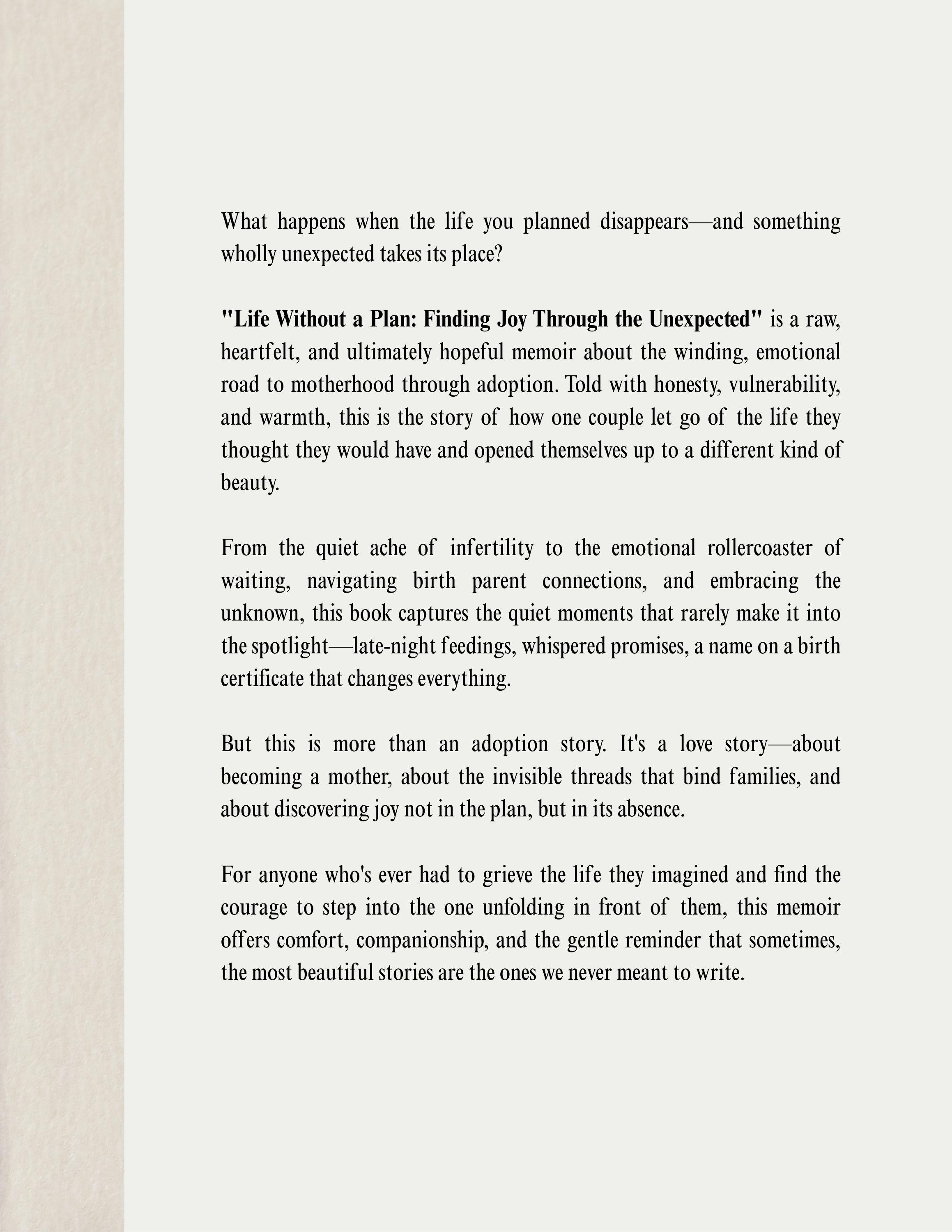 Life Without a Plan: Finding Joy Through the Unexpected is not a guidebook or a checklist. It’s a raw, honest account of love, loss, heartbreak, and hope. It’s about learning to let go of the life I envisioned and embracing the one that unfolded instead. It's about redefining what it means to build a family, to be a mother, and to find joy, even when things feel impossibly hard.