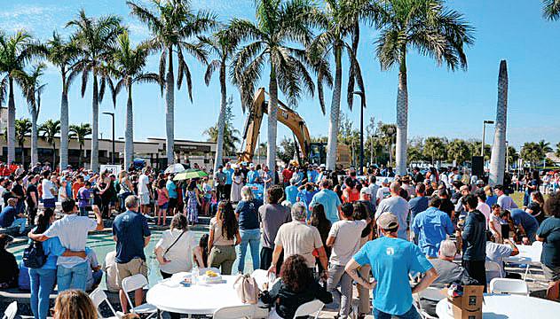 Above, the crowd gathers as construction begins for the new fellowship center at Cape Christian.