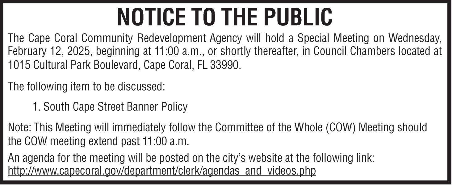 February 12, 19, 26, March 5, 2025 ###### IN THE CIRCUIT COURT OF THE 20TH JUDICIAL CIRCUIT IN AND FOR LEE COUNTY CASE NO. 24-DP-223-K2 IN THE INTEREST OF: J.J.P. DOB: 5/23/2024, MINOR CHILD NOTICE OF ACTION TERMINATION OF PARENTAL RIGHTS TO: Temistocle Caraballo, address unknown YOU ARE HEREBY NOTIFIED that the State of Florida, Department of Children and Families, has filed a Petition to terminate your parental rights and permanently commit the following child for adoption: J.J.P. born on 5/23/2024. You are hereby commanded to appear on March 6, 2025, at 9:00 AM before the Honorable Tracey Redd at the Lee Courthouse, 1700 Monroe Street Courtroom 3-A 3rd Floor Fort Myers, FL 33901, for an ADVISORY HEARING. FAILURE TO PERSONALLY APPEAR AT THIS ADVISORY HEARING CONSTITUTES CONSENT TO THE TERMINATION OF PARENTAL RIGHTS OF THIS CHILD (OR CHILDREN). IF YOU FAIL TO APPEAR ON THE DATE AND TIME SPECIFIED, YOU MAY LOSE ALL LEGAL RIGHTS AS A PARENT TO THE CHILD OR CHILDREN NAMED IN THIS NOTICE.