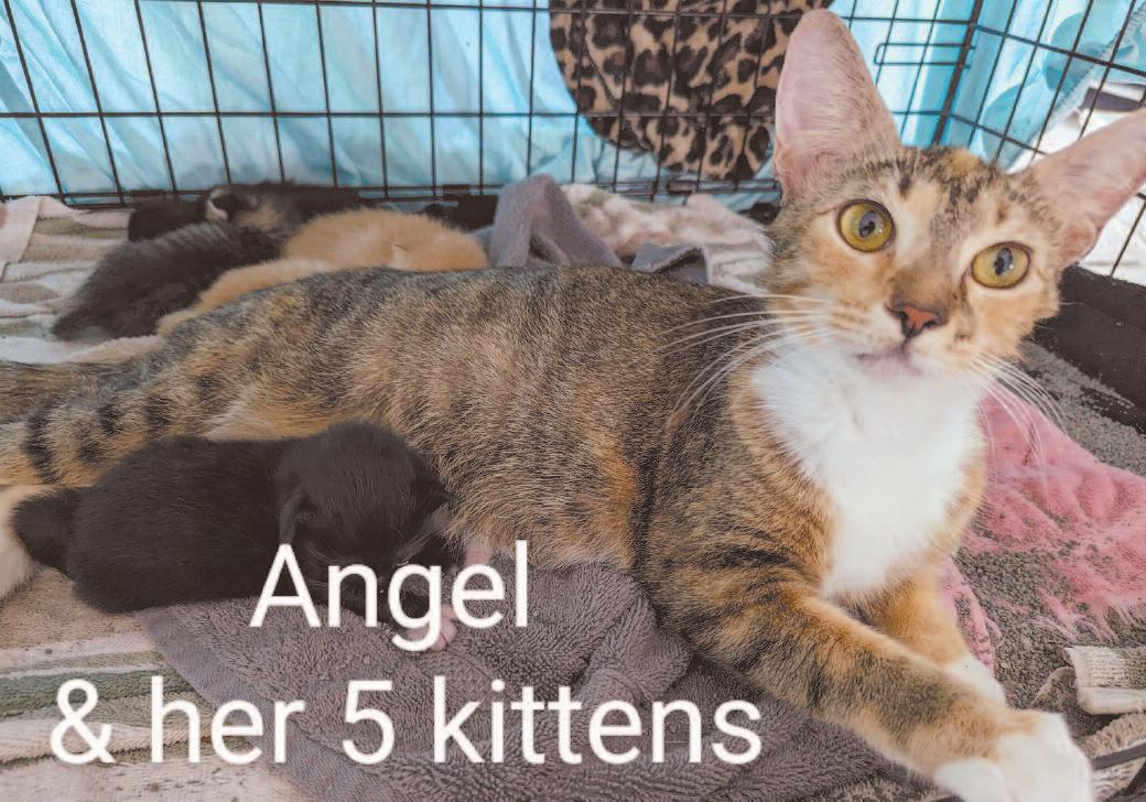 calico female who has five kittens that are now 12 days old She was a stray and we rescued her and her kittens from a nice lady who had been feeding her but did not get her spayed Her kittens are only 12 days old so will be awhile before they are adoptable after vetting