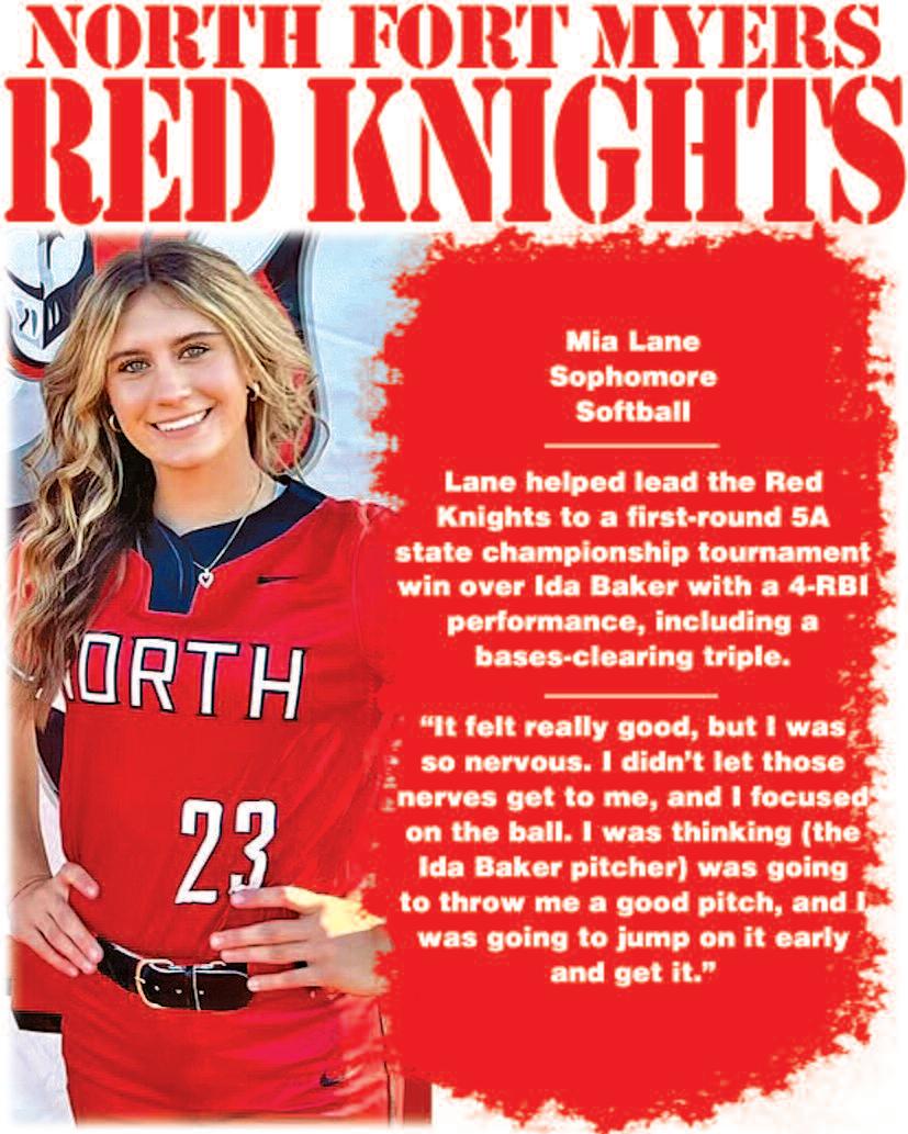 ■ M i a L a n e , N o r t h F o r t M y e r s R e d K n i g h t s , Sophomore: Lane helped lead the Red Knights to a firstround 5A regional championship tournament win over Ida Baker with a 4-RBI performance, including a bases-clearing triple
