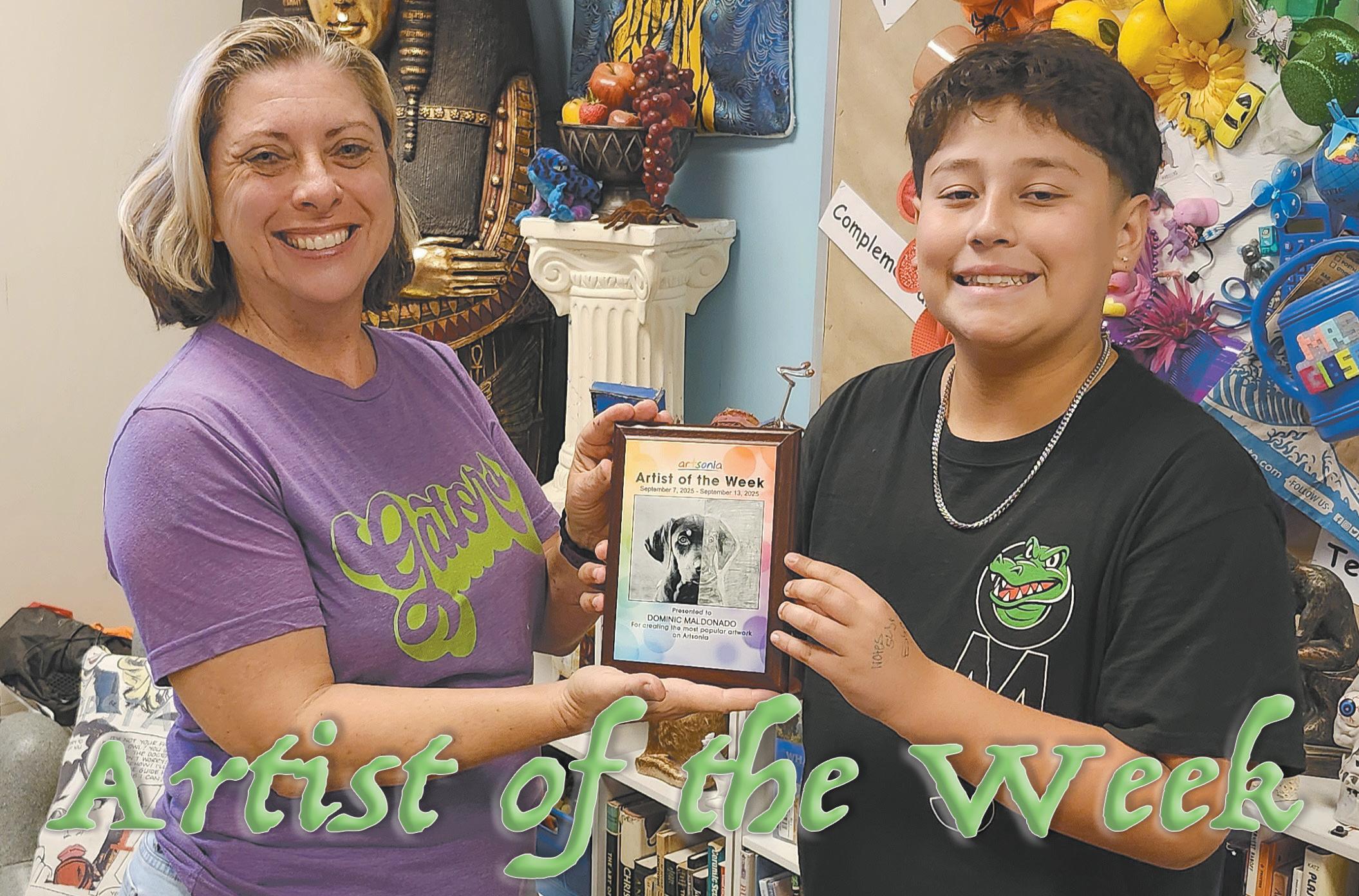 Oasis Middle School art teacher April Gibson and sixth grade student Dominic Maldonado PHOTO PROVIDED