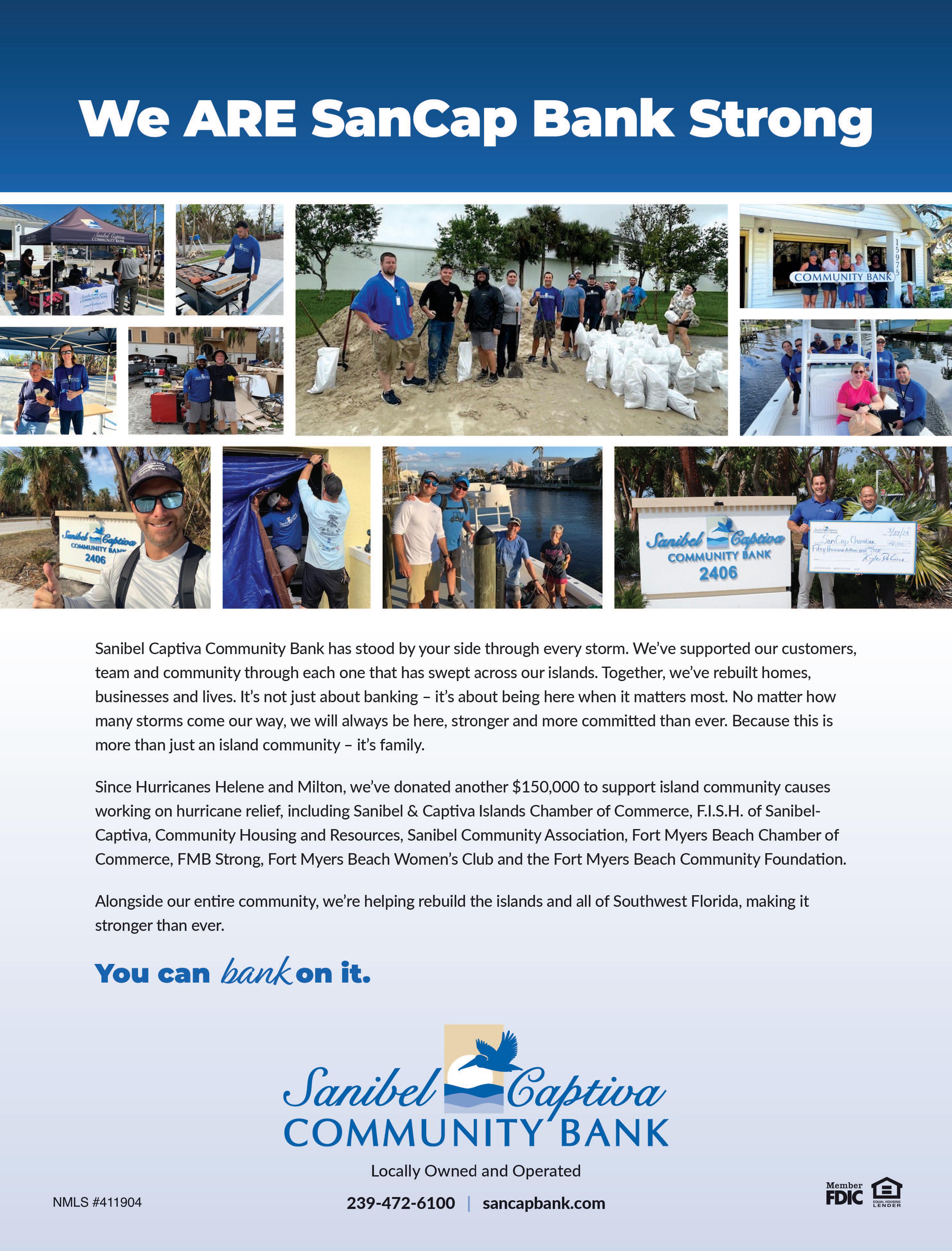 Rum Bar & Grille, for volunteers at the Bailey Homestead Pavilion on Sanibel Also, a team from the bank took part in the beach cleanup to remove debris and trash from Hurricanes Helene and Milton