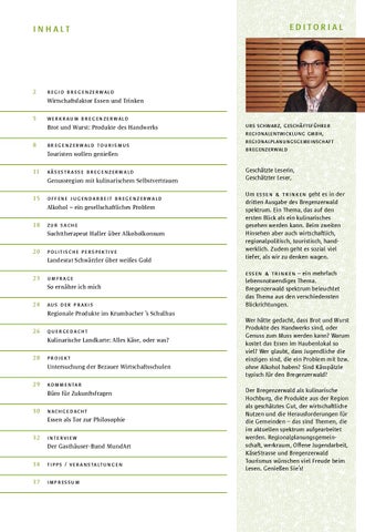 5 WERKRAUM BREGENZERWALD Brot und Wurst: Produkte des Handwerks 8 BREGENZERWALD TOURISMUS Touristen wollen genießen 11 KÄSESTRASSE BREGENZERWALD Genussregion mit kulinarischem Selbstvertrauen 15 OFFENE JUGENDARBEIT BREGENZERWALD Alkohol – ein gesellschaftliches Problem 18 z ur sache Suchttherapeut Haller über Alkoholkonsum 20 POLITISCHE PERS PEKTI V E Landesrat Schwärzler über weißes Gold 23 UMFRAGE So ernähre ich mich 24 aus der p raxis Regionale Produkte im Krumbacher ’s Schulhus 26 QUERGEDACHT Kulinarische Landkarte: Alles Käse, oder was? 28 projek t Untersuchung der Bezauer Wirtschaftsschulen 29 KOMMENTAR Büro für Zukunftsfragen 30 NACHGEDACHT Essen als Tor zur Philosophie 32 inter view Der Gasthäuser-Bund MundArt 34 TIPP S / VERANSTALTUNGEN 37 im pressum