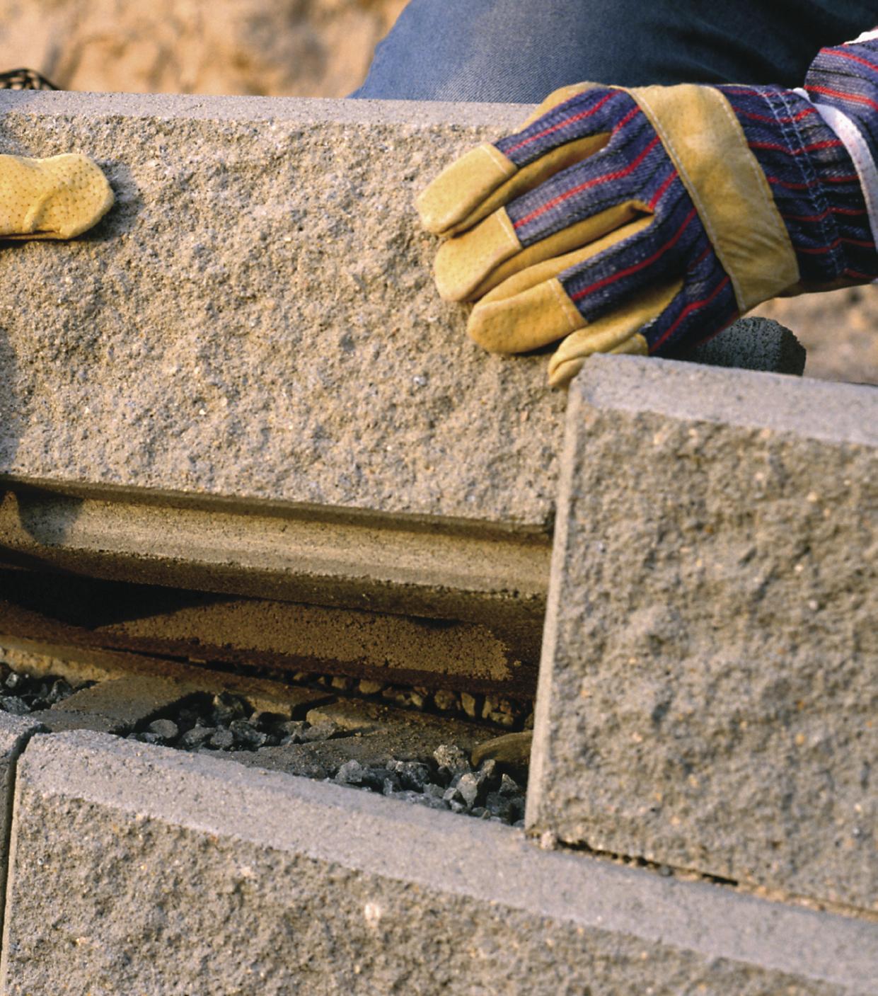 El sistema de construcción sin mortero de los muros ALLAN BLOCK permite que el agua desagüe libremente desde la parte trasera de las piezas. Se crea una área vertical de desagüe formada por una capa de grava, colocada en el interior y detrás de las piezas.