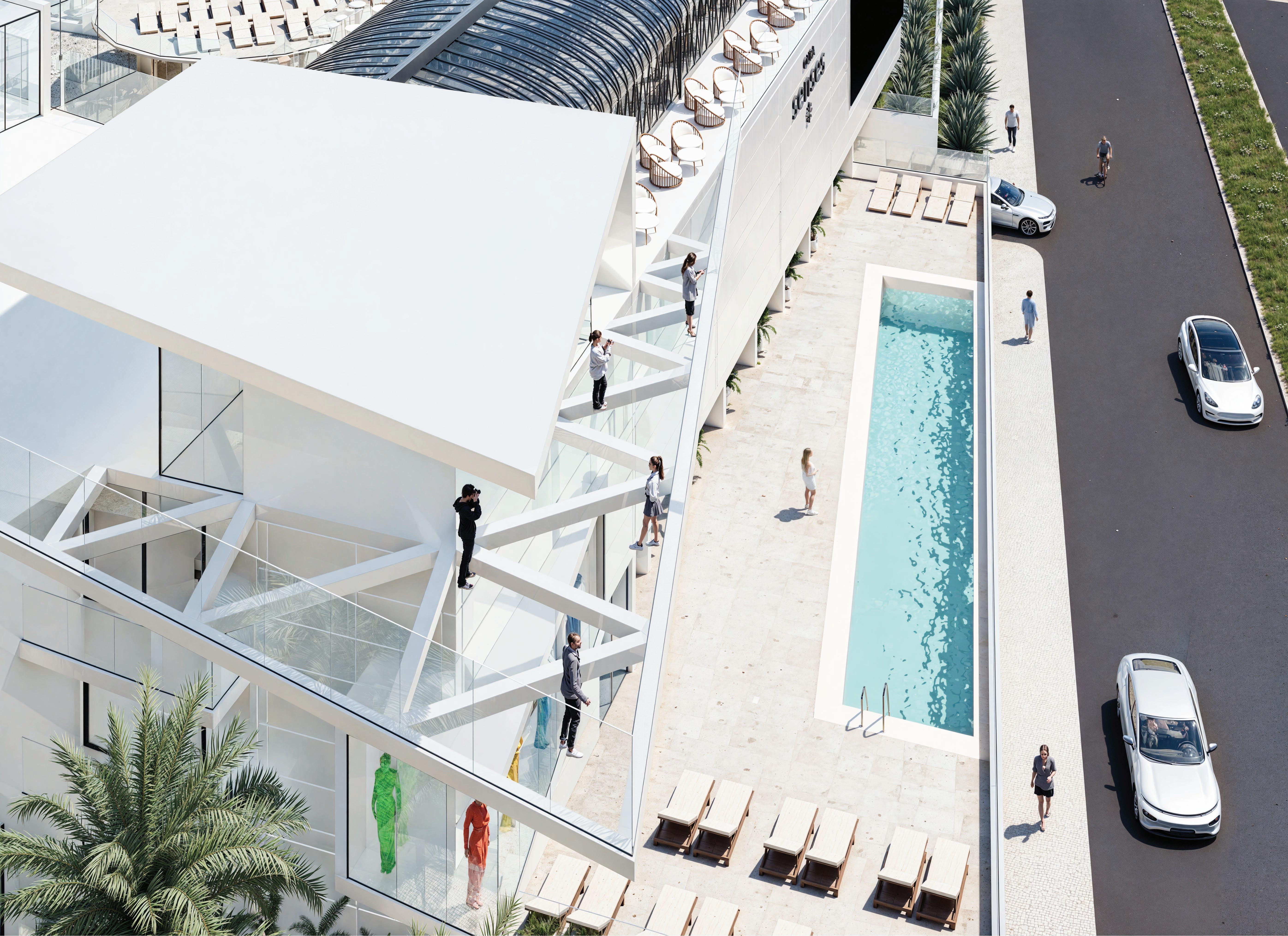 El proyecto Oura Senses es un hotel diseñado para la ciudad de Albufeira, en Portugal, con el objetivo de convertirse en un referente de hospedaje contemporáneo que combine confort, experiencia y atractivo visual. Desarrollado íntegramente en Revit y visualizado con D5 Render, el proyecto destaca por sus elementos particulares que resaltan la composición con respecto a su entorno, tales como, una plataforma de vidrio flotante como terraza panorámica, una fachada blanca brillante que acentúa la luz natural, una vitrina de exposición a doble altura y una pantalla tridimensional integrada como recurso de comunicación visual.